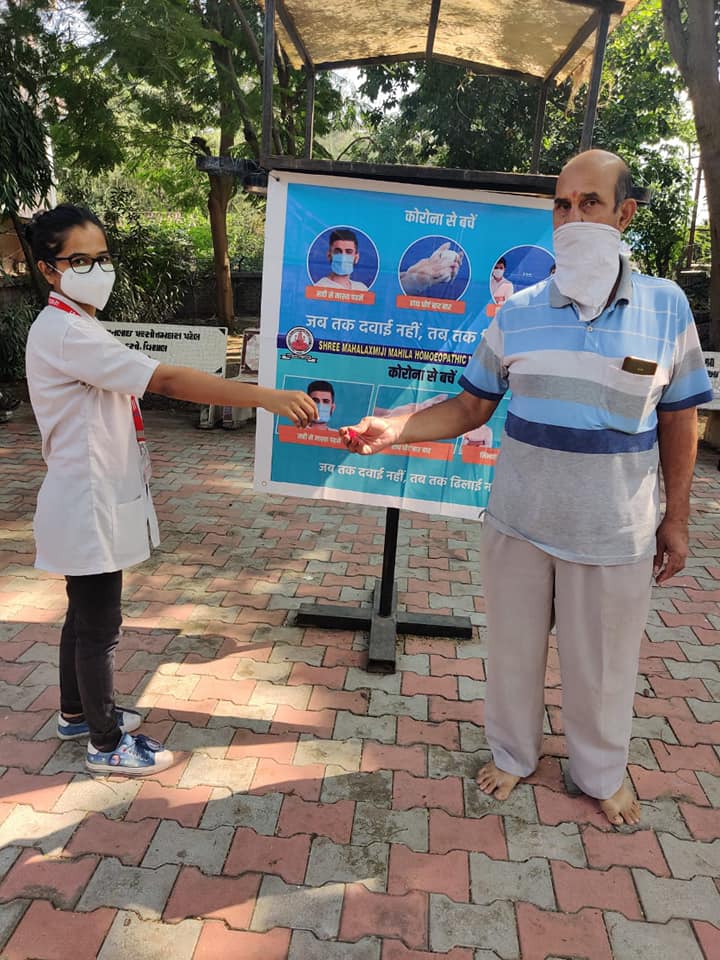 and gave information related to precautionary measures for COVID 19 prevention and distributed Ars Alb 30 preventive doses to around 250 - 300 people at Sahyog Garden,